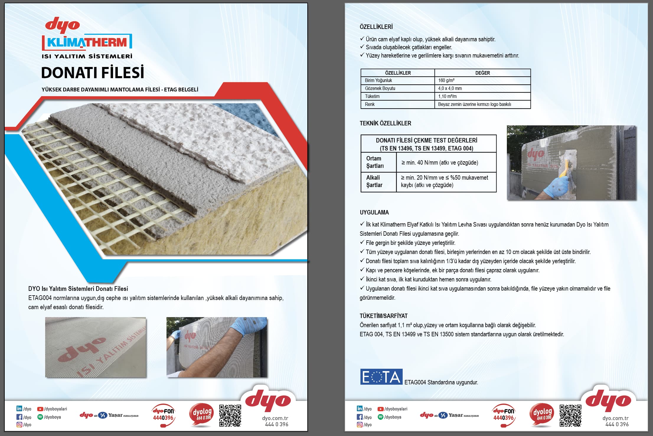 DYO Isı Yalıtım Sistemleri Donatı Filesi: ETAG004 normlarına uygun, dış cephe ısı yalıtım sistemlerinde kullanılan, yüksek alkali dayanımına sahip, cam elyaf esaslı, donatı filesidir.